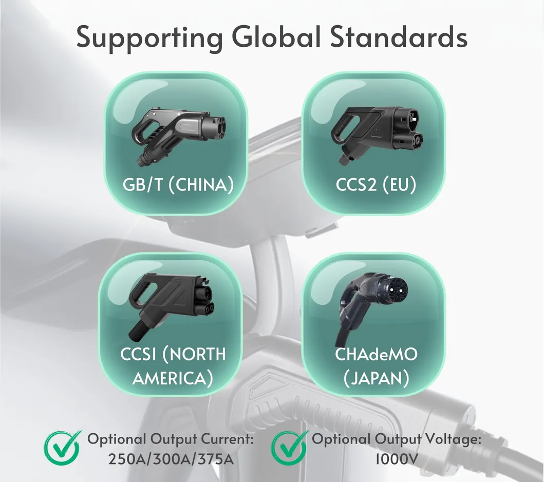 The station supports dual-gun charging with intelligent power allocation and is compatible with major global standards (CCS1, CCS2, GB/T and CHAdeMO). It operates reliably in a wide temperature range (-20°C to 65°C) and features robust IP55/IK10 protection.
